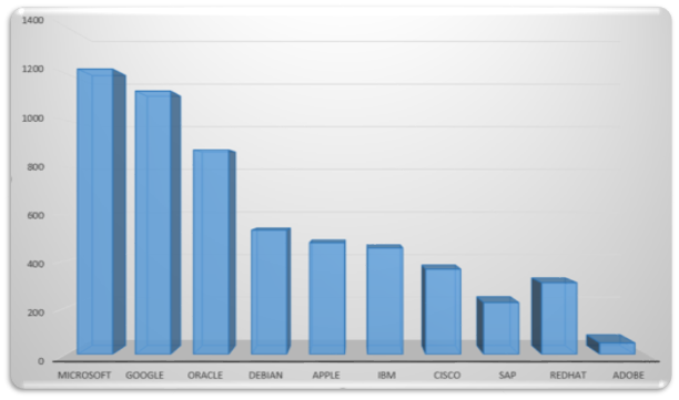 En el gráfico siguiente se pueden ver las vulnerabilidades por fabricante, Microsoft a la cabeza seguido muy de cerca por Google, y también se ve que Adobe está en la parte más baja, pero esto tiene una explicación y no precisamente hablamos de que los productos de Microsoft sean más vulnerables que otras, aunque así lo parezca, más que nada significa que su cuota de mercado es la más grande, por ello más «apetecible» para la comunidad de hackers y entonces el esfuerzo para hallar las debilidades es mayor, además, cada fabricante impulsa programas de incentivos, el cual se refiere a que el reporte de vulnerabilidades tiene recompensas, normalmente monetarias. Respecto a la creciente detección de vulnerabilidades en ciertos fabricantes, también hemos verificado que a mayor cantidad de vulnerabilidades descubiertas las respuestas también son rápidas en la publicación de actualizaciones de seguridad para solucionarlas.
